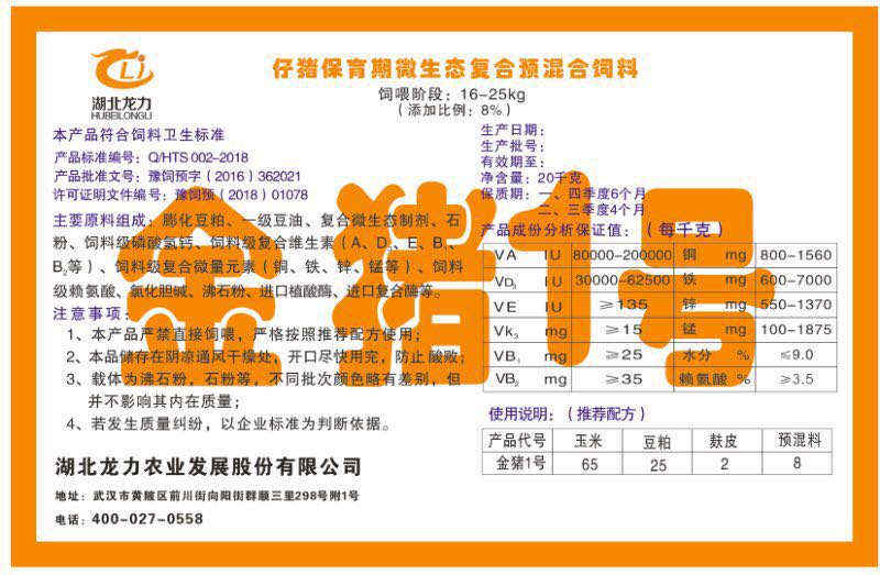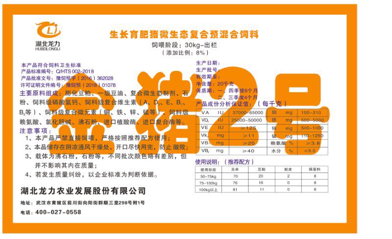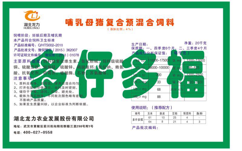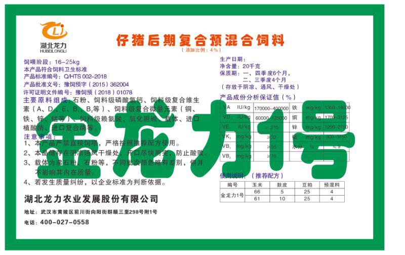 湖北龍力農(nóng)業(yè)發(fā)展股份有限公司坐落于武漢市黃陂區(qū)前川街向陽街群順三里298號附1號。公司成立于2014年6月,公司自成立以來把“創(chuàng)全球最大養(yǎng)豬綜合服務(wù)”為企業(yè)愿景。致力于打造教保料品牌”作為公司發(fā)展的明確目標。公司一直致力于豬營養(yǎng)的研究和開發(fā),積極與國內(nèi)外高校和科研機構(gòu)合作,推廣養(yǎng)豬技術(shù)、動物營養(yǎng)新概念,向世界農(nóng)牧企業(yè)學(xué)習(xí)與合作。公司采用國內(nèi)先進的生產(chǎn)工藝,選擇高精度電子配料秤,高均勻度、無殘留混合機等先進設(shè)備....